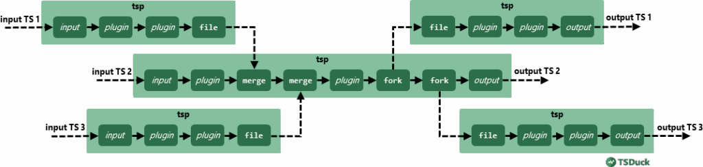 Specific plugins such as merge and fork respectively combine and duplicate transport streams. They are designed to route transport streams from and to other applications. When the “other” application is another instance of tsp, we can create complex processing graphs.
