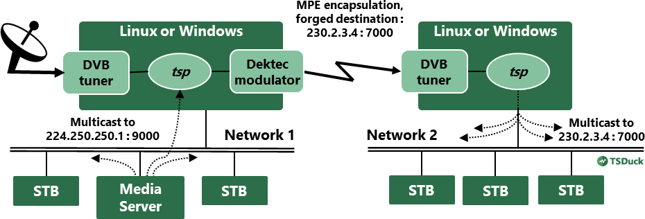 In network 1, a media server multicasts a transport stream on address 224.250.250.1, port 9000. We want to encapsulate this UDP multicast stream in an existing transport stream using MPE. This existing TS is a live satellite feed which is received using a DVB tuner.