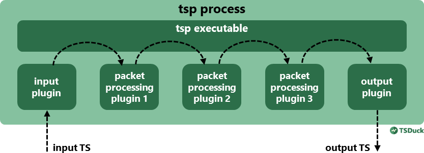 The most important TSDuck tool is tsp, the transport stream processor. It is a flexible transport stream processing framework. Running tsp is a combination of elementary processing operations using plugins.