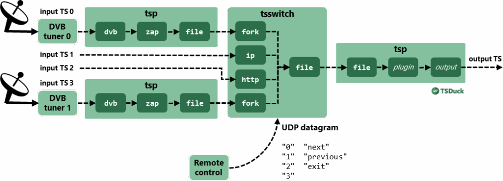 In addition to tsp, the command tsswitch can be used to switch inputs between a set of transport streams using the same input and output plugins as tsp. Switching between inputs can be performed automatically at the end of each input or through a remote control application. The remote control protocol is extremely simple, based on text messages in UDP datagrams.